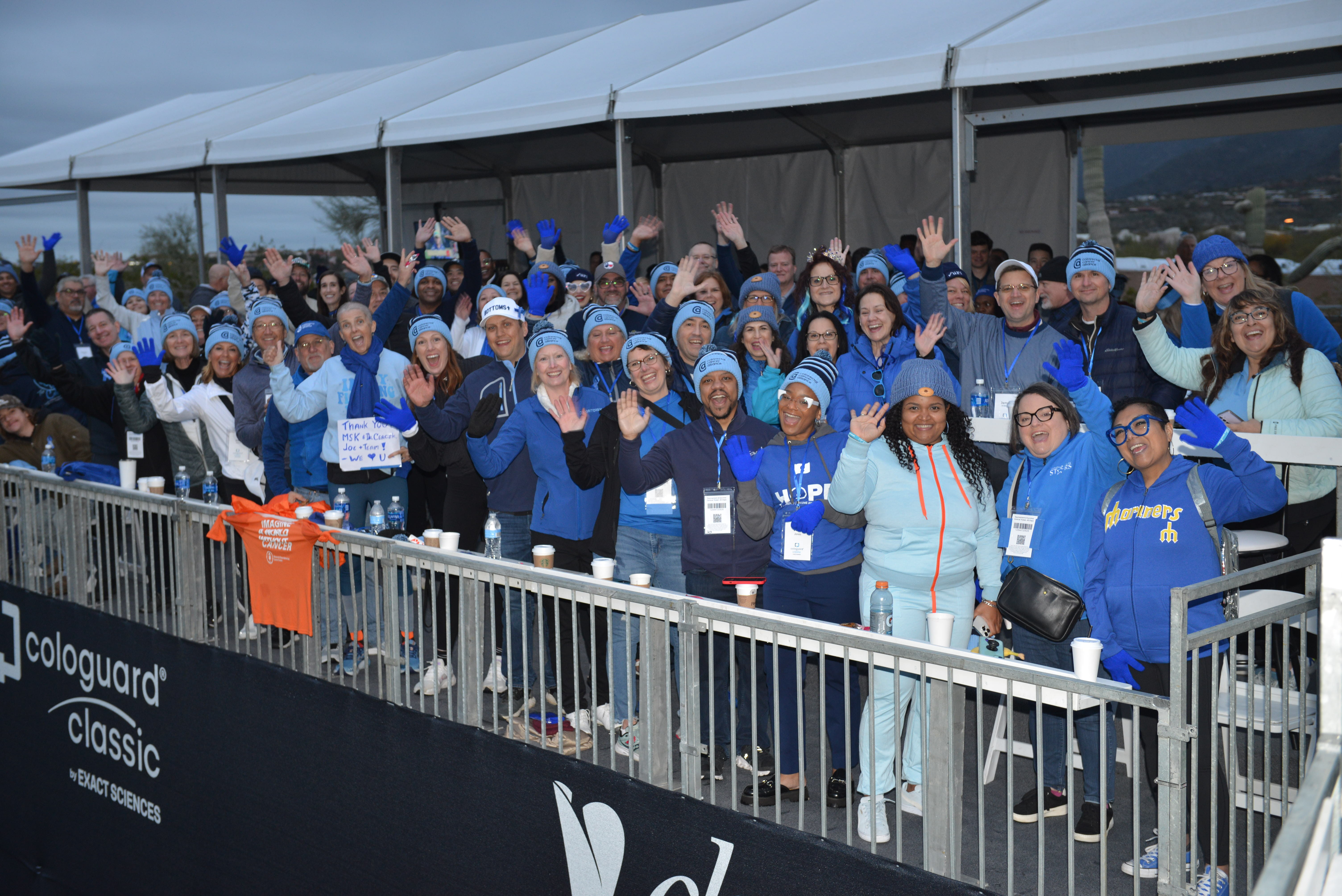 Crowning a winner: Joe Durant won the tournament’s iconic helmet-shaped trophy, awarded by local community coalition Tucson Conquistadores. Durant, who lost his nephew to cancer in 2023, golfed in honor of stage 4 CRC patient Amanda Meckstroth, who was on hand to see the win. During the closing ceremony, CRC survivors ringed the 18th hole wearing blue shirts designed by Tracy Comas, a CRC survivor representing the Colon Cancer Coalition.