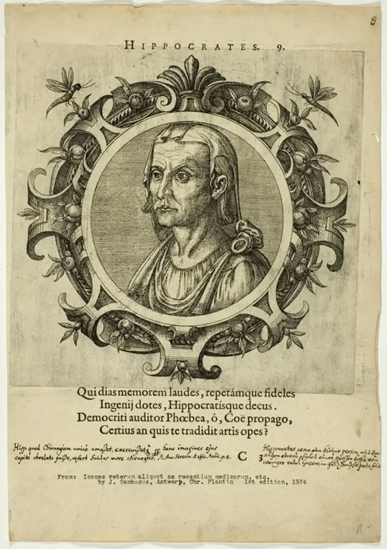 Portrait of Hippocrates. Unknown artist, published by Johannes Sambucus in 1574. The first half of the Latin caption reads something like this: “Those who remember the gods and repeat their praises are faithful, endowed with ingenuity and Hippocratic virtues.” (Courtesy of The Art Institute of Chicago)