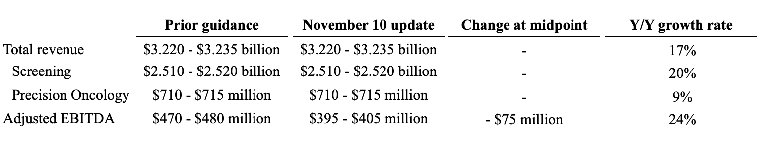 Important factors that could cause actual results, conditions and events to differ materially from those indicated in the forward-looking statements include, among others, the following: our ability to successfully develop and commercialize new products and services and assess potential market opportunities; our ability to successfully and profitably market our products and services; the acceptance of our products and services by patients and healthcare providers; our reliance upon certain suppliers; our ability to retain and hire key personnel; approval and maintenance of adequate reimbursement rates for our products and services within and outside of the U.S.; the amount and nature of competition for our products and services; the effects of any judicial, executive or legislative action affecting us or the healthcare system; government shutdowns and changes in government policies, laws, regulations, and staffing; recommendations, guidelines and quality metrics issued by various organizations regarding cancer screening or our products and services; our ability to obtain and maintain regulatory approvals and comply with applicable regulations; our ability to protect and enforce our intellectual property; our success establishing and maintaining collaborative, licensing, and supplier arrangements; the results of our validation studies and clinical trials, including the risks that the results of future studies and trials may differ materially from the results of previously completed studies and trials; our ability to manage an international business and our expectations regarding our international expansion and opportunities; the potential effects of changing macroeconomic conditions and geopolitical conflict; the possibility that the anticipated benefits from our business acquisitions or collaborative or licensing arrangements will not be realized in full or at all or may take longer to realize than expected; the possibility that the anticipated benefits from our restructuring and cost reduction initiatives will not be realized in full or at all or may take longer to realize than expected; the outcome of any potential litigation or legal proceeding; and our ability to raise the capital necessary to support our operations or meet our payment obligations under our indebtedness. The risks included above are not exhaustive. Other important risks and uncertainties are described in the Risk Factors sections of our most recent Annual Report on Form 10-K and any subsequent Quarterly Reports on Form 10-Q, and in our other reports filed with the Securities and Exchange Commission. We undertake no obligation to publicly update any forward-looking statement, whether written or oral, that may be made from time to time, whether as a result of new information, future developments or otherwise